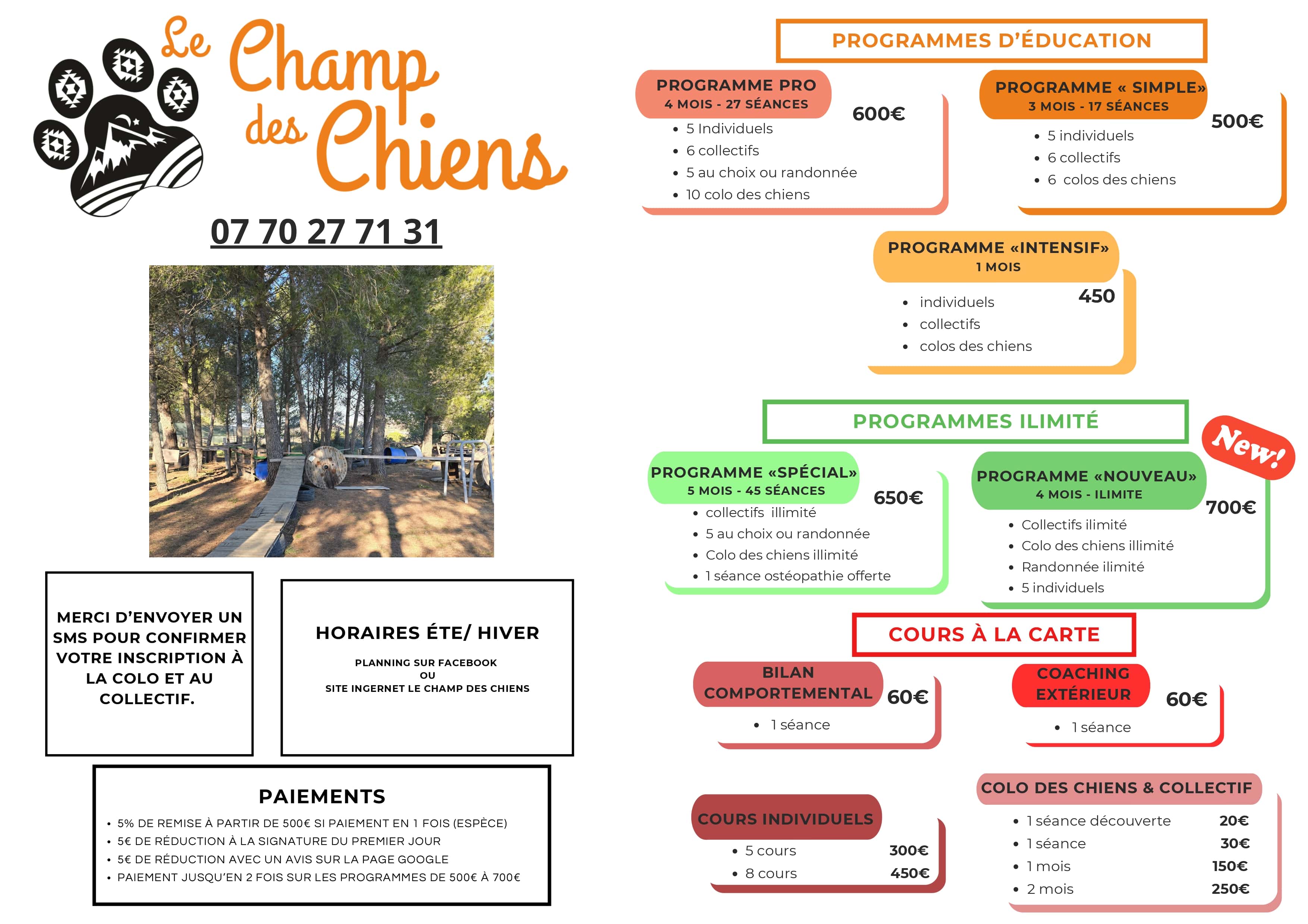 Nous comprenons l'importance de la transparence en matière de tarification, c'est pourquoi nous vous présentons ci-dessous nos tarifs clairement définis pour chaque service que nous proposons. Chez nous, vous pouvez être assuré(e) de bénéficier d'un excellent rapport qualité-prix et de la satisfaction de voir votre chien s'épanouir dans un environnement stimulant et sécurisé.